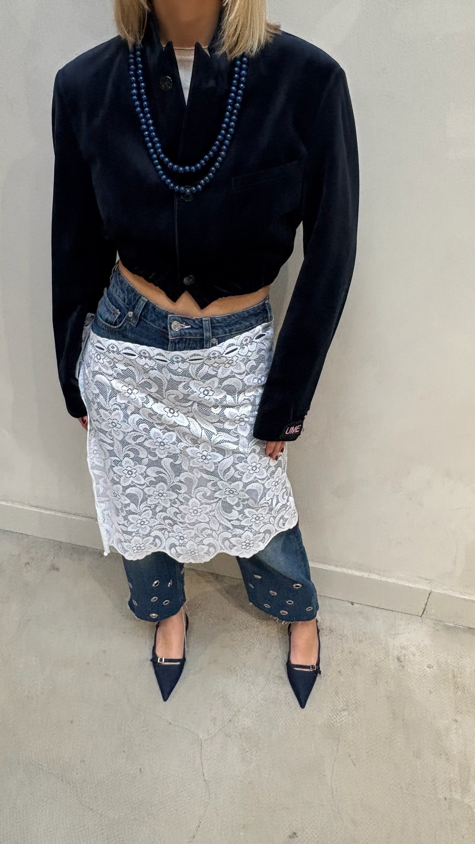 Handcrafted in our Amsterdam atelier, a straight-leg denim jeans, upcycled with studs at the bottom of the legs. The lace skirt is NOT included. A one of a kind design created with care, intention and modern craftsmanship.