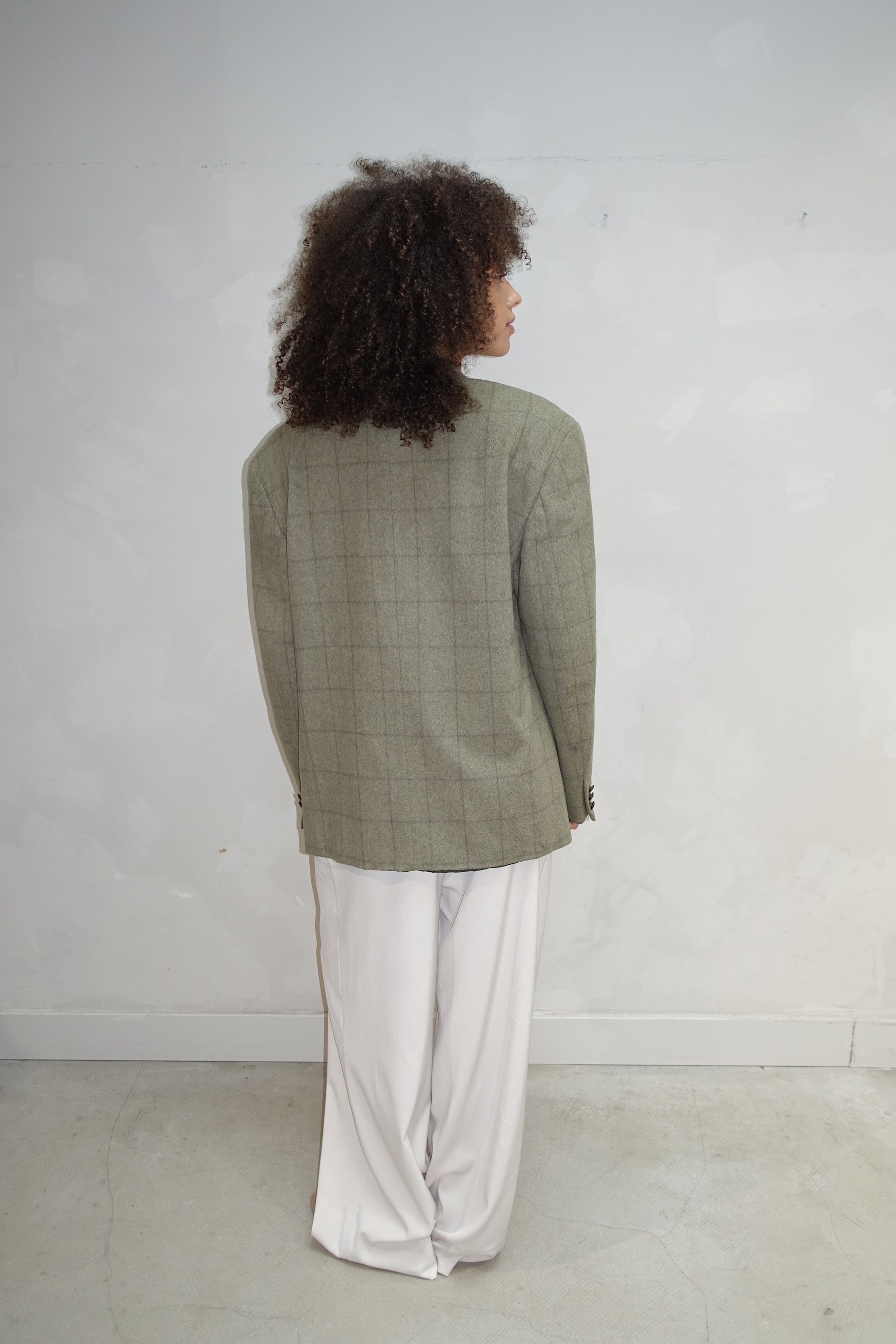 A stunning green blazer adorned with a vintage brooch, blending timeless tailoring with distinctive character. The rich green hue adds depth and elegance, while the brooch introduces a nostalgic, one-of-a-kind accent. Sophisticated yet expressive, this piece effortlessly elevates any look with classic charm and modern flair.