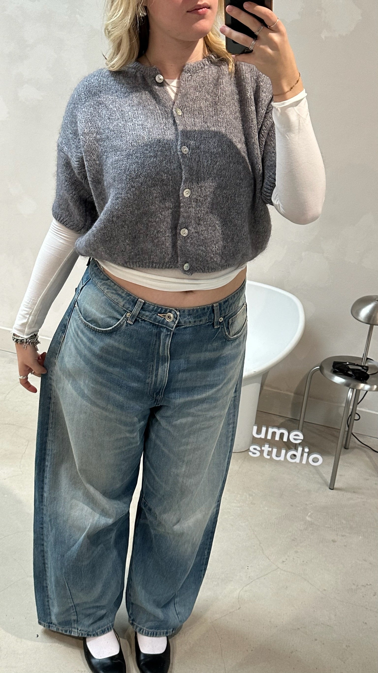 A soft grey knitted cardigan with short sleeves — simple, chic, and endlessly versatile.
